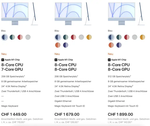 Das Display ist nur 24 Zoll gross. Das ist nach heutigen Massstäben nicht viel und wenn es Ihnen zu klein scheint, warten Sie noch einige Wochen oder Monate, bis Apple die dicken Brummer von der Leine lässt, die mit 27 Zoll oder vielleicht noch mehr kommen.Was noch? Auf der Produktseite des iMacs können Sie die Geräte frei konfigurieren. Dabei sollten Sie das Augenmerk auf folgenden Eigenheiten richten.