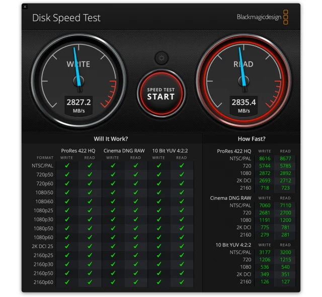 Auch das SSD liefert mehr, als man von so einem kleinen Rechner erwarten würde: Gemessen mit dem kostenlosen Disk Speed Test von Blackmagic erreichte der iMac beim Lesen und Schreiben über 2,8 GB pro Sekunde! Damit lässt sich gut arbeiten.