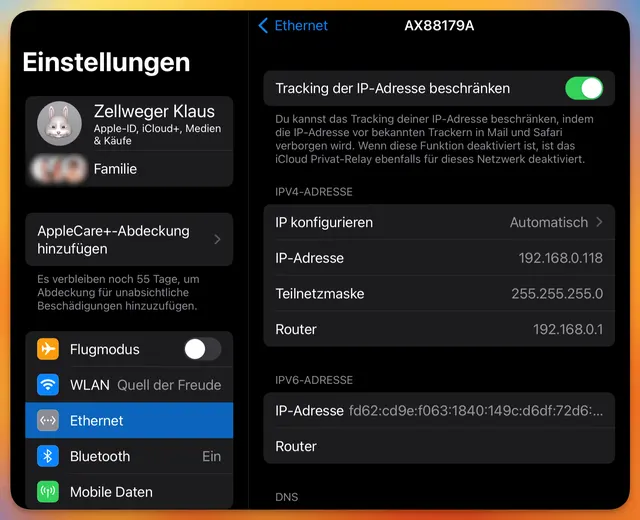 Wi-Fi. Die «Wi-Fi»-Ausführung schafft es nur über Wi-Fi 6E ins Internet – oder über den Hotspot, der vom iPhone aufgebaut wird. Der Vollständigkeit halber sei erwähnt, dass das iPad Pro über einen USB-C-Adapter direkt mit einem Ethernet-Kabel verbunden werden könnte – ohne weitere Einstellungen. Aber das wird im wirklichen Leben wohl kaum zur Tagesordnung gehören.