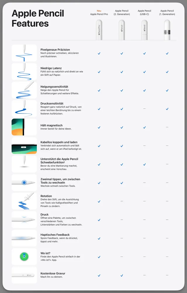 Durch die neue Platzierung der Face-Time-Kamera versagt die magnetische Halterung des Apple Pencil der 2. Generation – und damit erledigt sich auch die induktive Ladung. Oder anders gesagt: Ein bestehender Pencil ist nicht zum neusten iPad kompatibel. Umgekehrt funktioniert der Pencil Pro nicht mit anderen iPad-Pro-Modellen. Erfreulicherweise wird das neue Modell genau wie die ältere Generation für 129 Franken verkauft – nur mit viel mehr Zucker obendrauf.