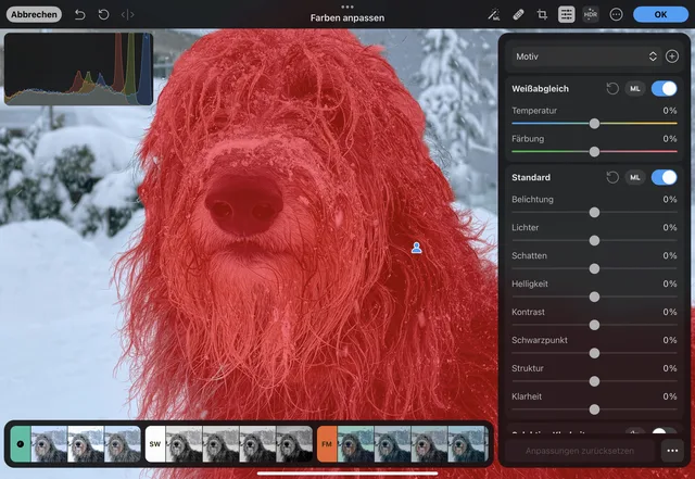 Photomator stützt sich stark auf die Neural Engine, um Bilder automatisch zu optimieren. Aber auch komplexe Aufgaben wie die Erzeugung von hochwertigen Masken funktionieren am iPad Pro so schnell, dass nie das Gefühl einer Wartezeit aufkommt.