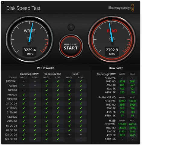 Hier heisst es aufgepasst. Unser Testgerät war mit 16 GB RAM und 1 TB SSD ausgestattet. Der Test mit der kostenlosen Software Disk Speed Test von Blackmagic zeigte im Mittel ca. 3,2 GB (schreiben) und 2,8 GB (lesen).