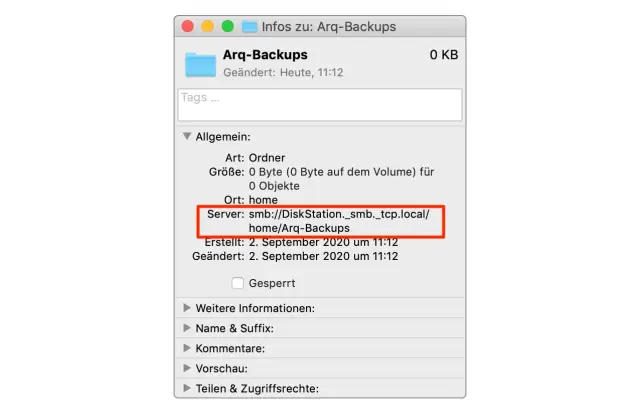 Eine unerwartete Herausforderung stellte sich bei Backups auf den NAS unter macOS, weil der Pfad nicht akzeptiert wurde. Klicken Sie unter macOS im Finder den Zielordner an und wählen Sie im Menü «Ablage» den Befehl «Informationen»: