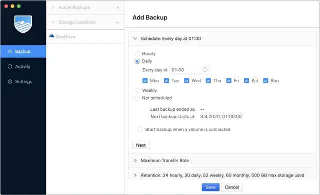 Und so klicken Sie sich durch die vertikalen Register und legen weitere Parameter fest, etwa den maximalen Speicher, den das Backup verbrauchen darf. Dabei gilt es zu berücksichtigen, dass Arq auch gelöschte oder geänderte Dateien behalten kann, solange der Speicher reicht. Wenn also genug Platz vorhanden ist, sollten Sie bei der Zuteilung nicht knausern:
