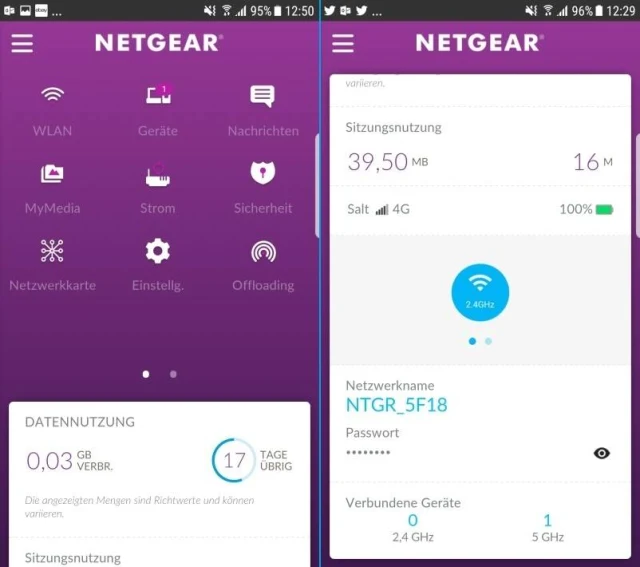 Zur App: In ihrem Hauptmenü werden u.a. die Datennutzung «GB verbraucht», der Provider, sowie Netzwerkname angezeigt. Links oben befindet sich ein Button, der zu den erweiterten Einstellungen führt. Dort können Anwender die Reichweite und die Kanalbreite der WLAN-Verbindung feintunen, um Tempo und Reichweite zu erhöhen. Unter Netzwerk lässt sich zudem auch der Anbieter für den mobilen Internet-Zugang («APN») auswählen oder bei Bedarf ändern.
