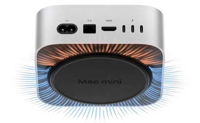 Bei der Leistung befindet sich Apple mit seinem hauseigenen M-SoC (System on Chip) in einer äusserst komfortablen Situation. Kein anderer PC-Hersteller kann auf einen so leistungsfähigen und gleichzeitig stromsparenden Chip zurückgreifen, um damit ein komplettes, hervorragend abgestimmtes Desktop-Betriebssystem zu befeuern. Der M4 benötigt ausserdem wenig Strom; das wiederum reduziert die Wärme – und erst damit wird es möglich, in einem so kompakten Gehäuse das Netzteil einzubauen, ohne dass die Hitze das System kollabieren lässt.Lüfter. Dessen ungeachtet kann auch der Mac mini im Vergleich zu einem iPad Pro mit M4-SoC nicht ganz auf einen Lüfter verzichten. Das thermische Design saugt die Luft von unten an, leitet sie über das SoC und führt sie nach unten wieder durch den Sockel ab. Der Lüfter war im Test im Standard-Betrieb nie zu hören und der Rechner fühlte sich gerade einmal handwarm an. Wenn der M4 Pro tatsächlich längere Zeit unter Volllast läuft, macht sich ein dezentes Rauschen bemerkbar, das jedoch weit weg vom klassischen «Lüfterlärm» entfernt ist.