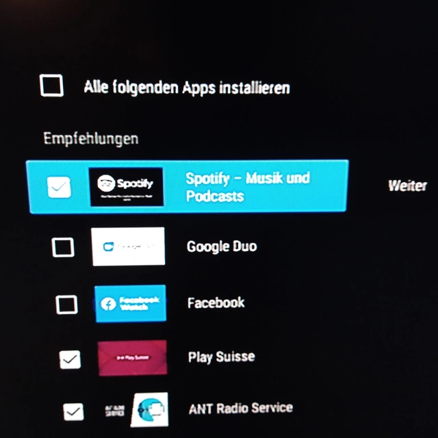 Weitere Google-Apps, die man auswählen kann – darunter sind Play Suisse (SRF) und Zattoo
