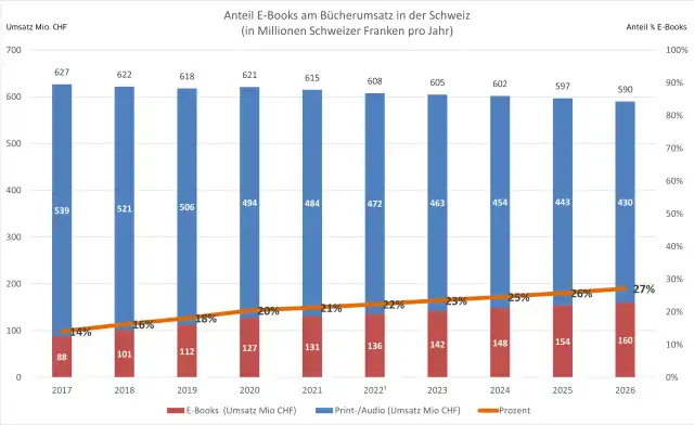 Bild 1:Die Entwicklung des gesamten Bücherumsatzes in der Schweiz, mit entsprechendem Anteil an E-Books; ab 2022 handelt es sich um Prognosen (Datenquellen: PwC/Omdia, via Statista)