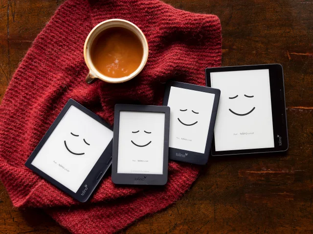 Wollen Sie nicht auf Amazon setzen, benötigen aber dennoch eines mit Hörbuchunterstützung? Wühlen Sie im Sortiment von PocketBook. Der Schweizer Hersteller bietet die Audiofunktionen nicht nur in seinen Color-Geräten, sondern auch im Touch HD 3 Grey, InkPad X, Era Sunset Copper und Inkpad 3 Pro. Sind ein Farbdisplay und Hörbuchwiedergabe auf dem E-Reader für Sie kein Thema, werfen Sie einen Blick auf die Tolinos.