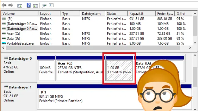 Angenommen, auf Ihrem PC ist das SSD seitens Hersteller in Laufwerk C: (System) und D: (Daten) unterteilt. Die wollen Sie nun zusammenführen – aber dazwischen liegt eine Wiederherstellungspartition, die das verhindert.